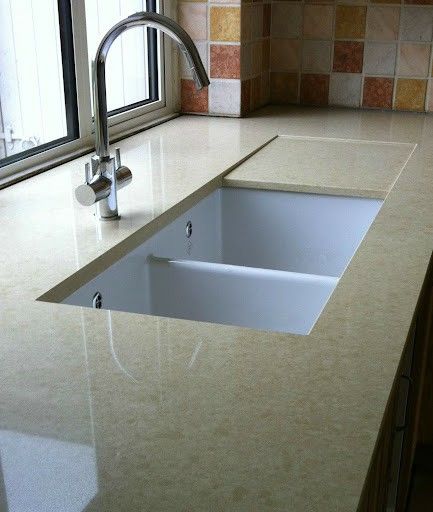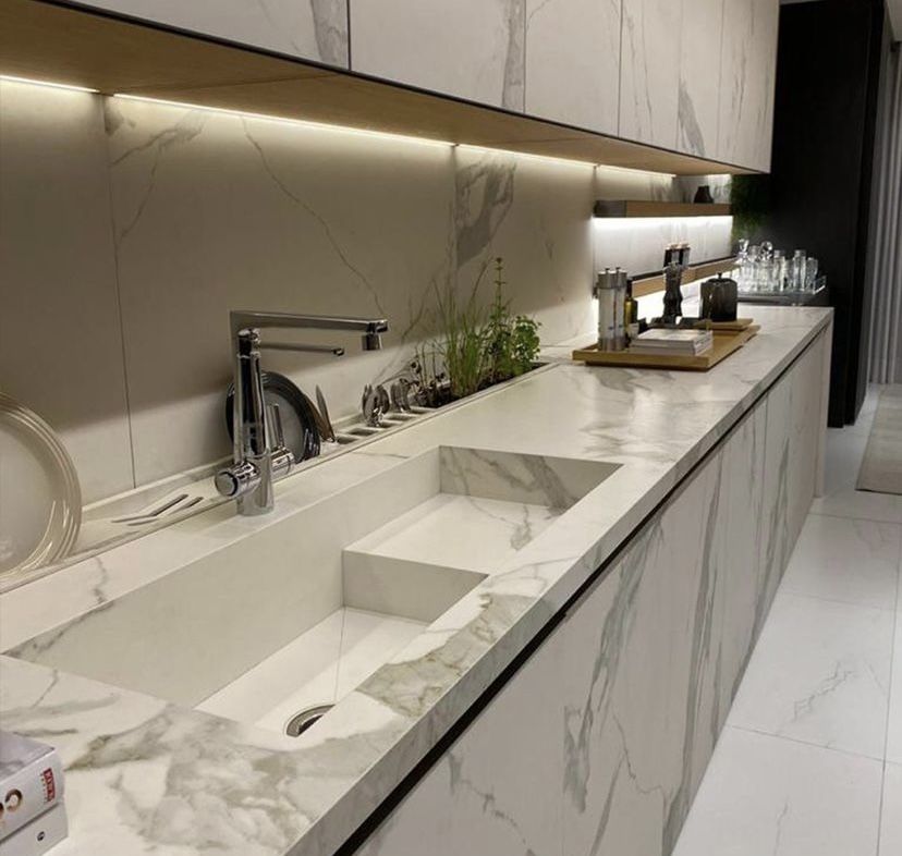 Model tanam menjadi pilihan utama di dapur modern karena tampilannya yang rapi dan menyatu dengan permukaan meja. Keramik ditempelkan langsung ke dalam meja dapur, sehingga tidak menyisakan banyak sambungan visual yang mengganggu.