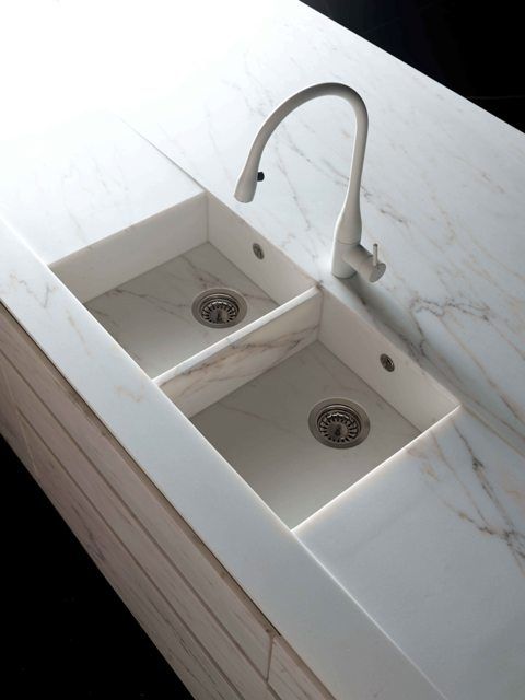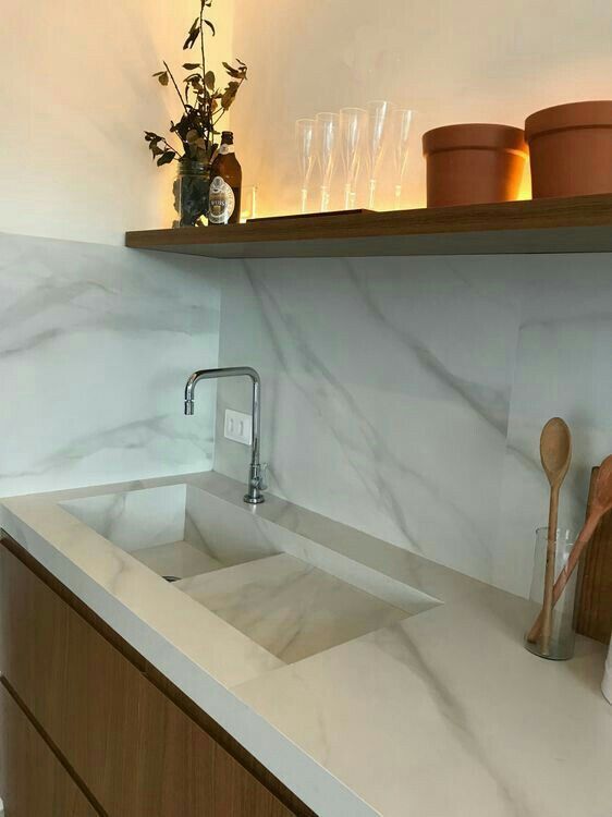 2. Tempat Cuci Piring Keramik dengan Backsplash yang Menyatu